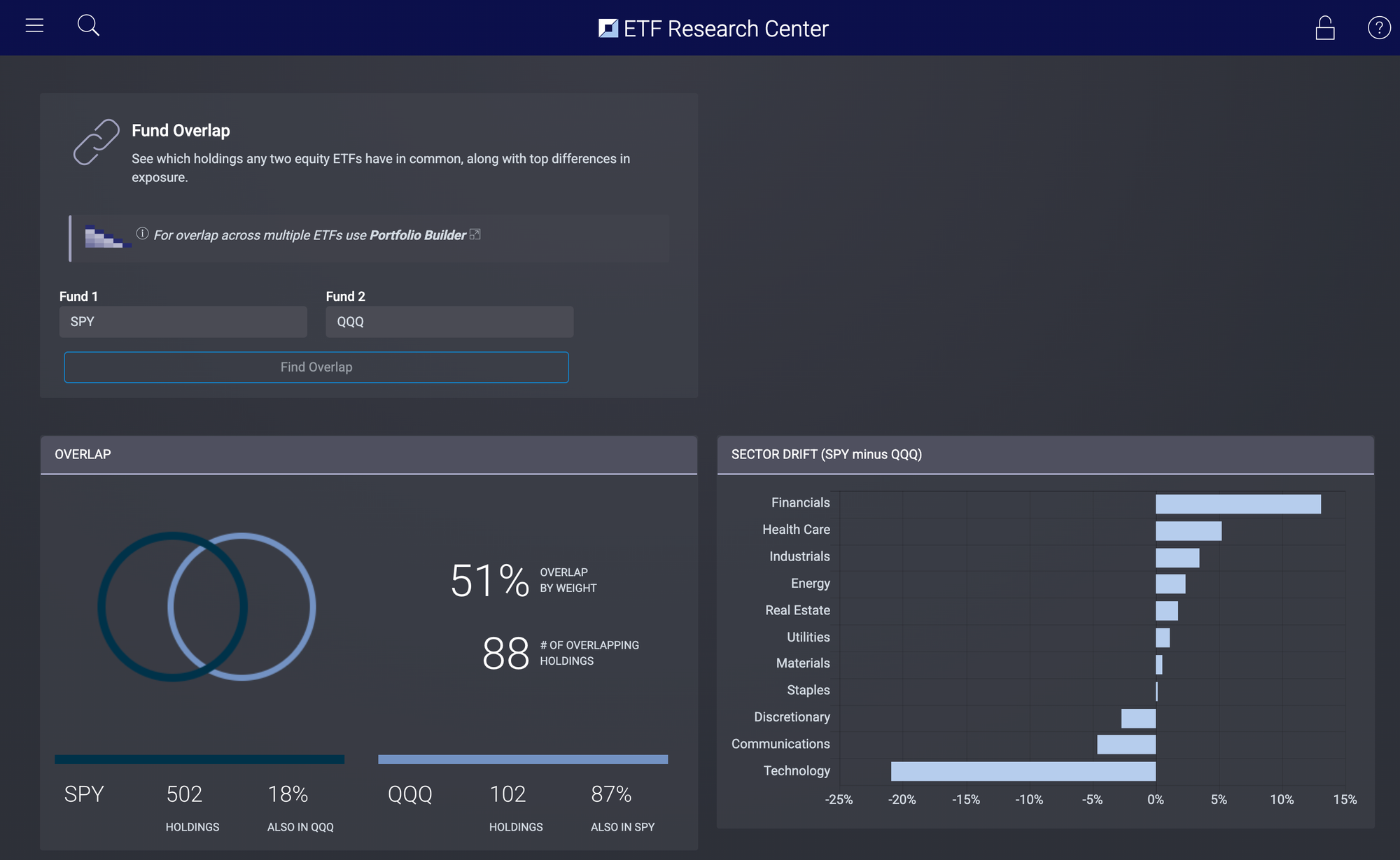 QQQ 和 SPY 有 51% 的重叠率,SPY 持仓的股票 18% 也在 QQQ 中,QQQ 持仓股票的 87% 都在 SPY 持仓列表里。几大科技巨头也都是两支 ETF 的重仓股,风险集中。不建议同时重仓这两支 ETF,重叠率太大。
