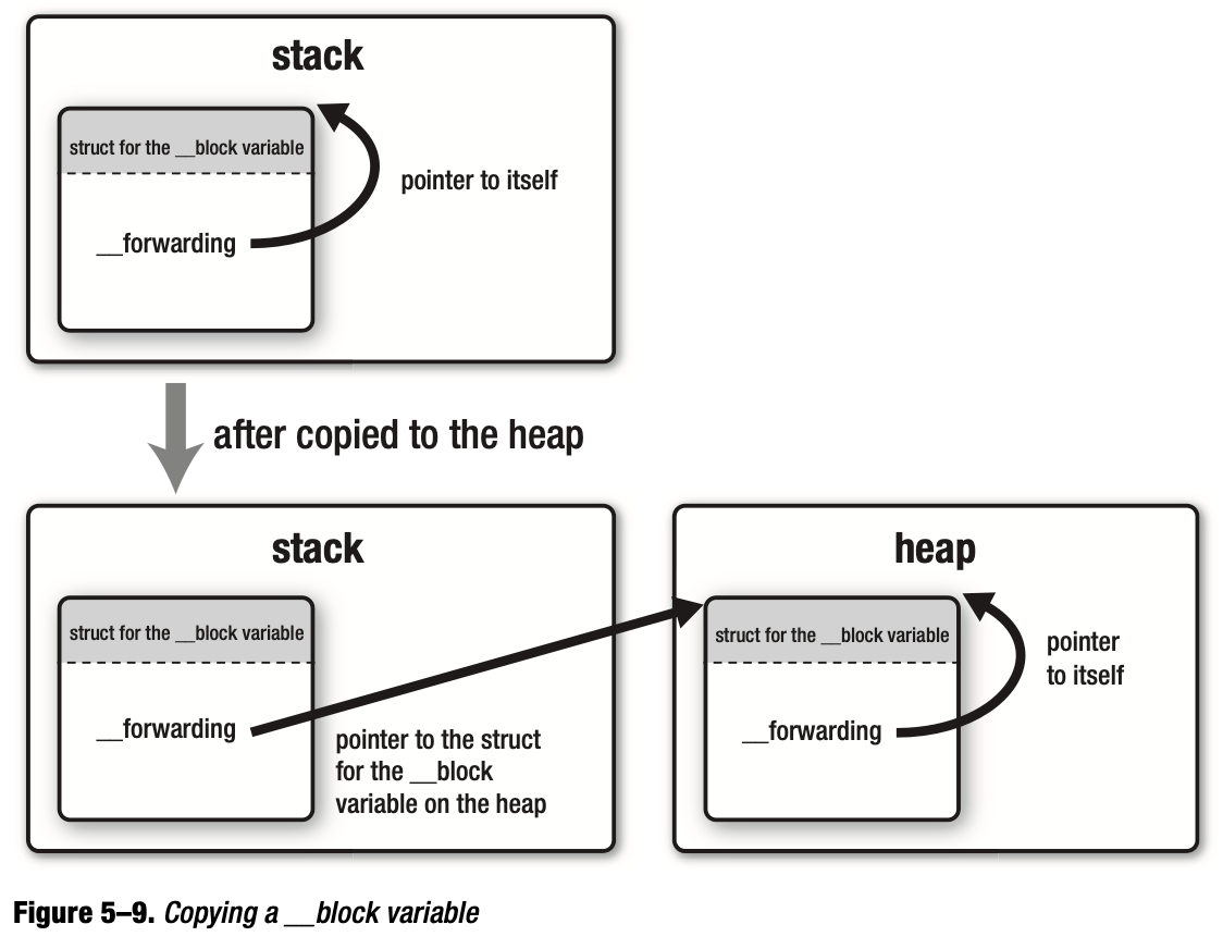 当 __block 变量拷贝到堆区前后,Block 内部使用这个变量时都是通过 __forwarding 来获取当前实际的变量。