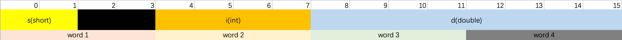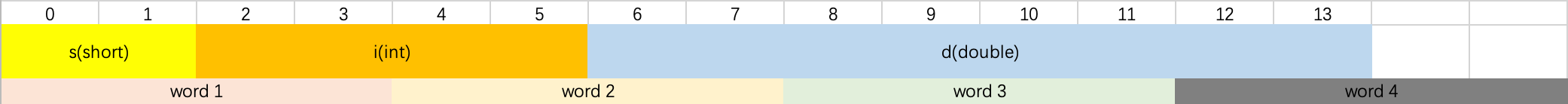 总共占用 2 + 4 + 8 = 14 个字节。在已知 struct 起始地址,也就是上图中位置为 0 的地址的情况下,CPU 想要访问成员 i 的话需要跨两个字长,也就是需要两次访问。访问结束后将两次访问的数据拼在一起才能得到成员 i 的完整数据。