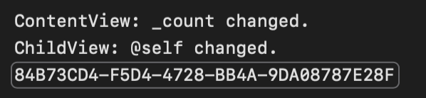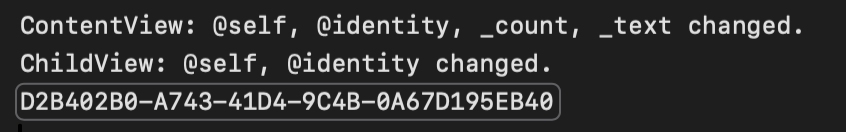 点击 Count 按钮,ContentView 的 count 增加,触发了更新,打印了@count 。而这个操作也让 Count 按钮下面的 ChildView 被重新创建了,所以 ChildView 打印了 @self ,且 uuid 发生变化。